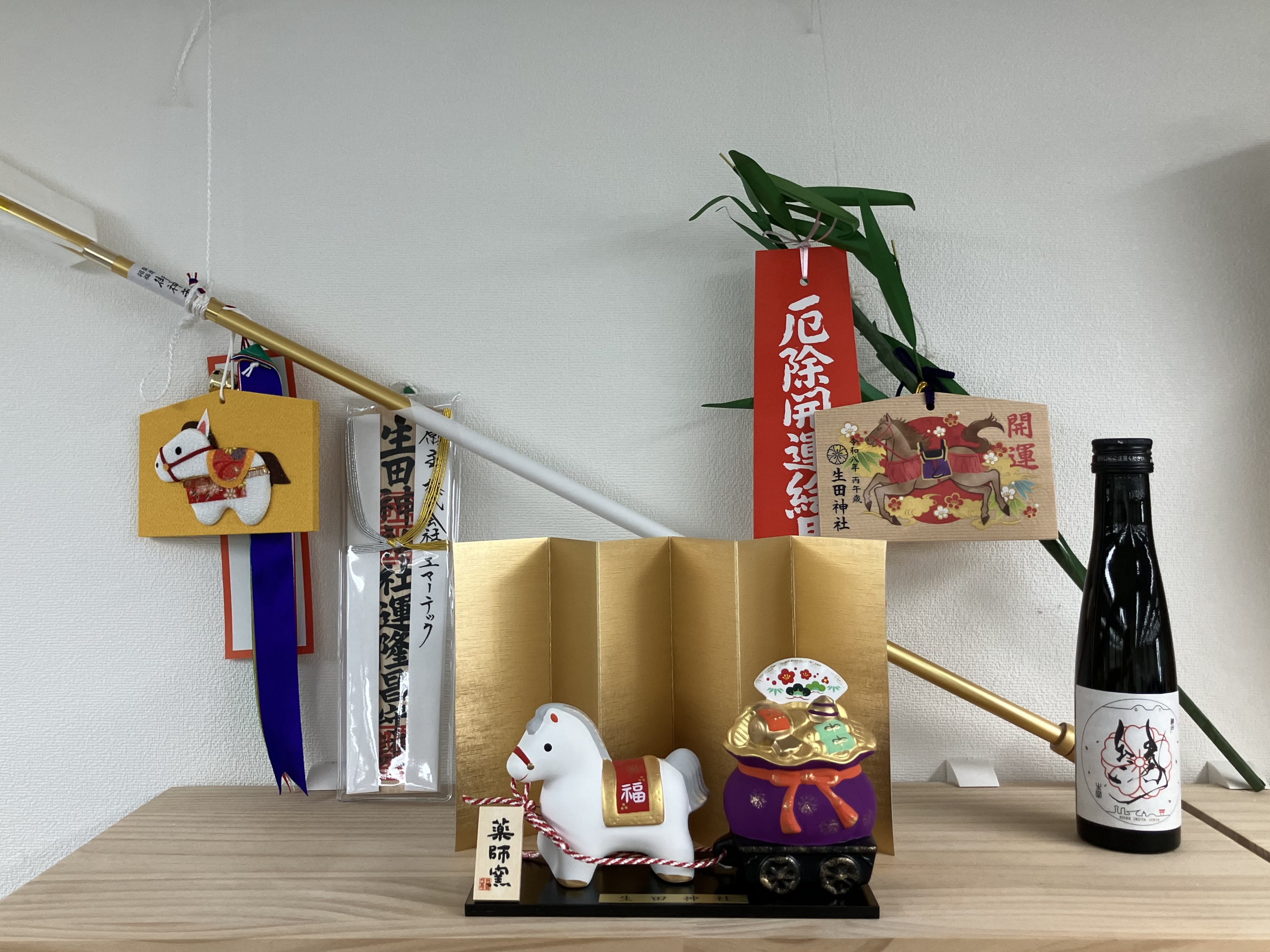 御札、破魔矢、午の置物、撤饌、絵馬笹をいただいたので、社内に祀りました。