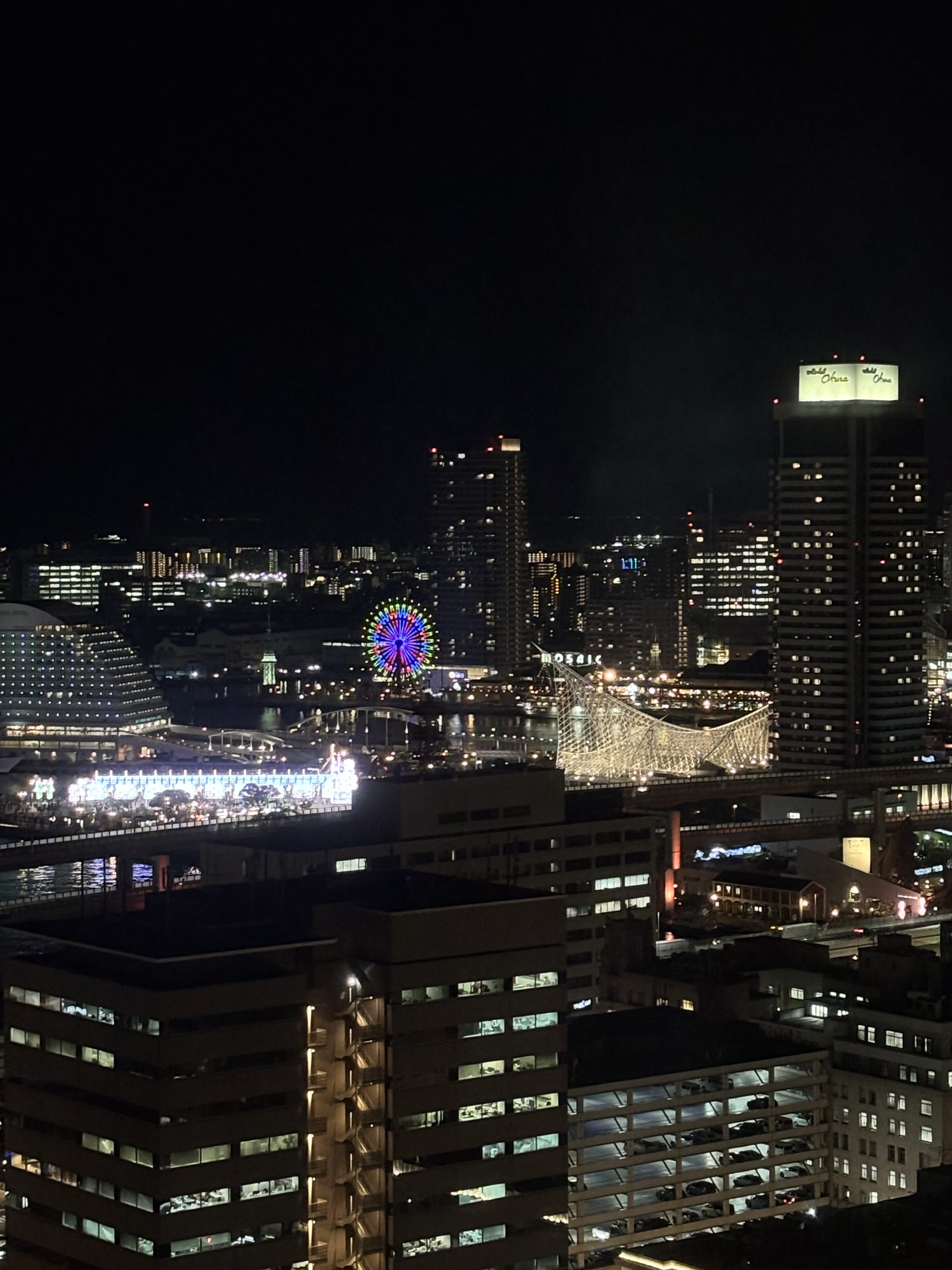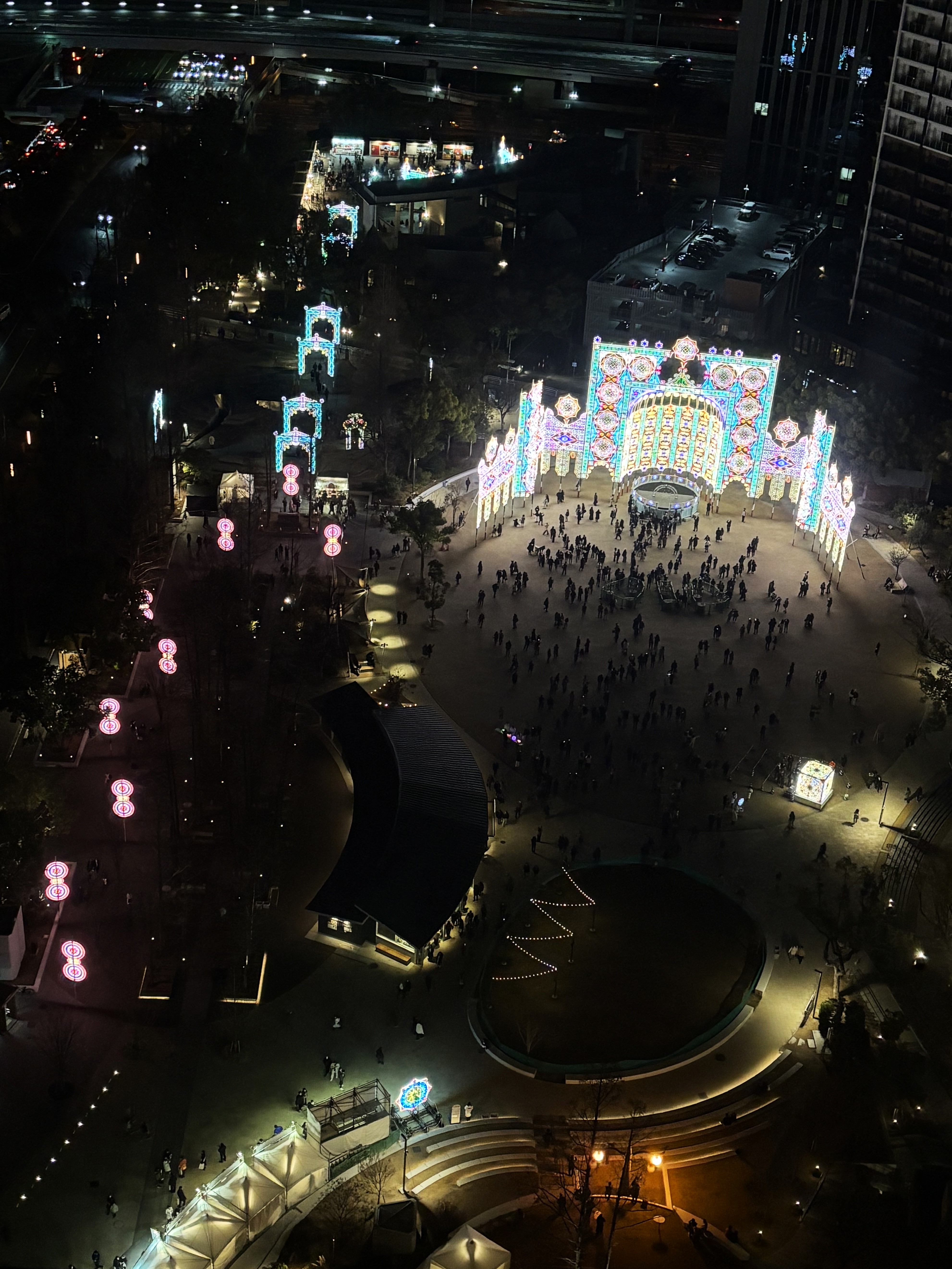 神戸市役所の展望台からは、ルミナリエで彩られた東遊園地と、その先に広がるハーバーランドの夜景を一望できます。